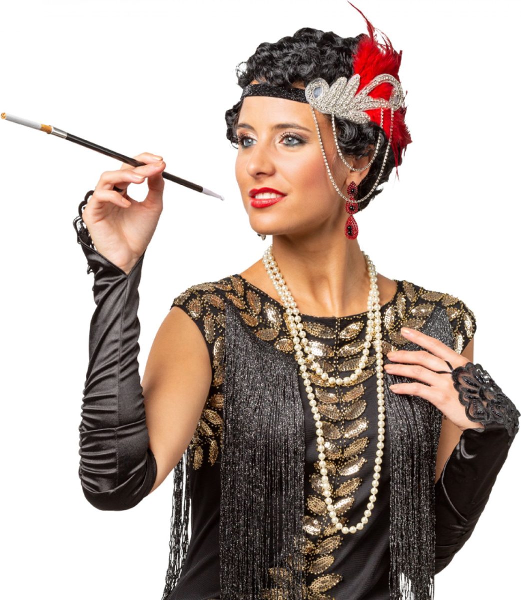 Kompletný 5-dielny set v štýle 20. rokov – rukavice, čelenka, náhrdelník, náušnice a cigaretová špička.