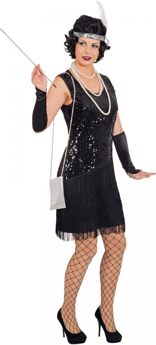 Vystupte z davu s těmito černými Charleston šaty zdobenými třásněmi a flitry – ideální volba pro Gatsby party, retro večírek či tématickou akci.
